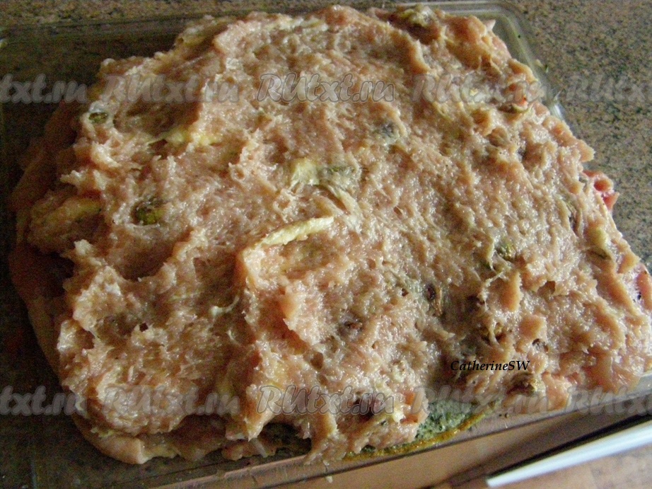 12. На основу рулета (кожа с мясом) выложим яичный блин, сверху - куриный фарш.