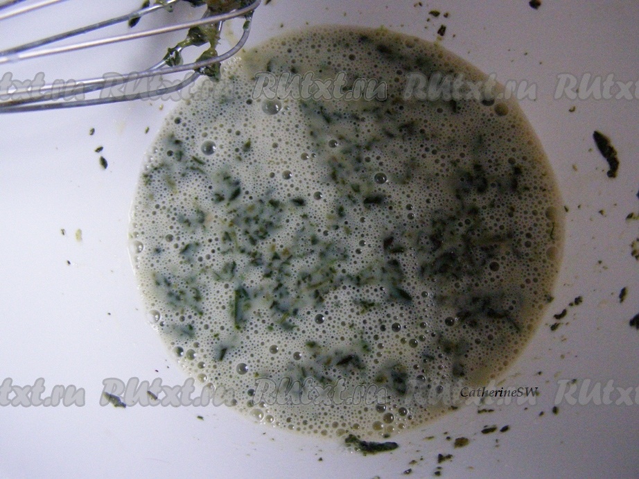 8. Слегка взобьем яйца, добавим молоко и шпинат, перемешаем.