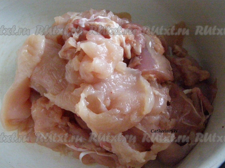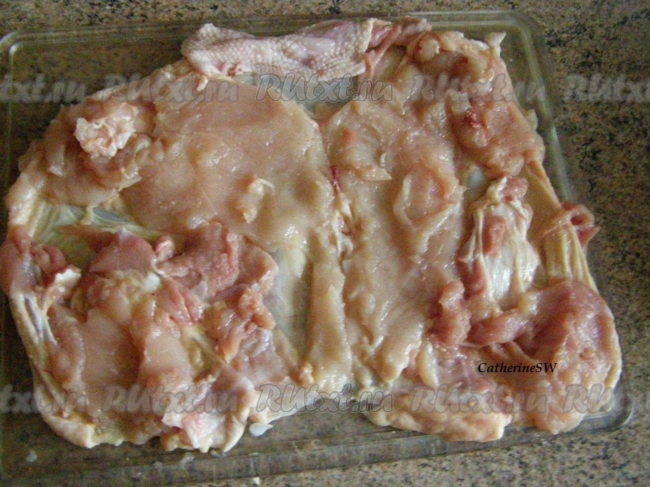 3. Срежем мясо с кожи так, чтобы на коже остался только тонкий слой. Посолим и поперчим.