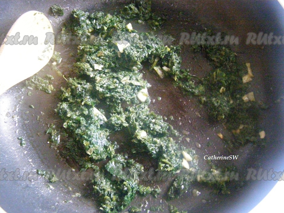 7. На среднем огне на масле под закрытой крышкой прогреем шпинат минут пять, посолим и поперчим. Остудим.