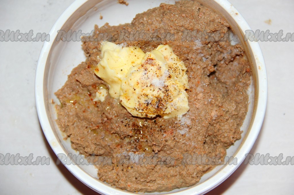 К печени добавить 70 грамм мягкого сливочного масла, соль, чёрный молотый перец, взбить погружным блендером.