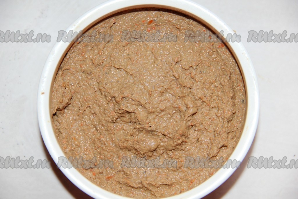 Сливочное масло нужно достать из холодильника заранее, чтобы оно согрелось и стало достаточно мягким. Жареную куриную печень вместе с морковью и луком взбить погружным блендером до получения однородного паштета.