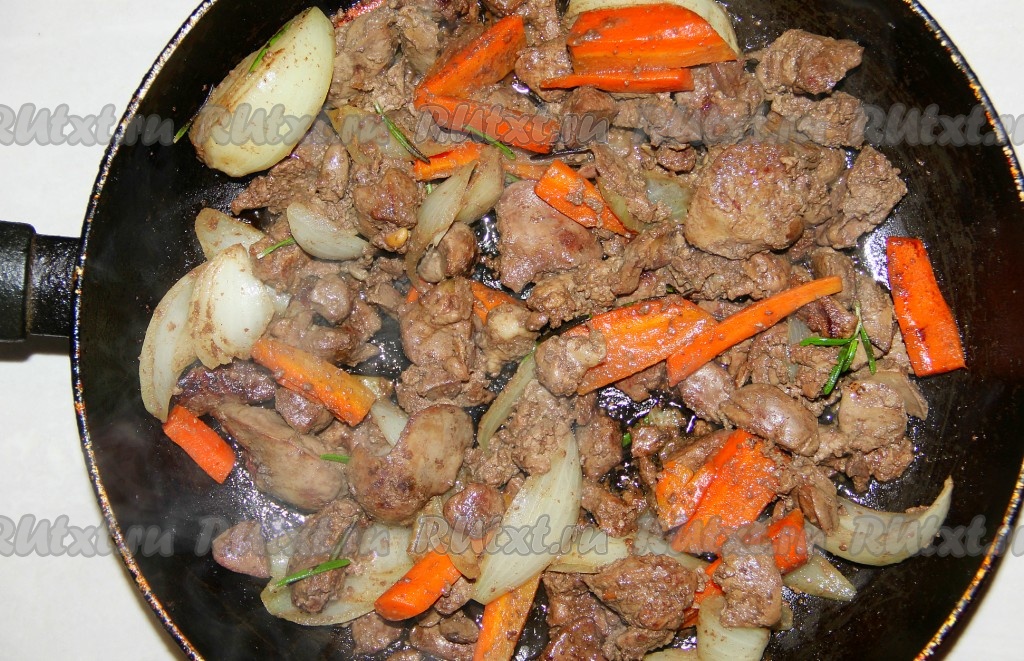Куриную печень вымыть, обсушить. Если печёнка крупная, разрезать на 2-3 части. Лук и морковку очистить. Морковь нарезать на тонкие брусочки (или натереть на крупной тёрке). Лук нарезать на средние кусочки (я в этот раз нарезала достаточно крупно, лучше нарезать помельче). В сковороде прогреть растительное масло, выложить лук, обжарить его до прозрачности (на это потребуется 4-5 минут), иногда помешивая, на среднем огне. Затем выложить морковку, перемешать овощи и обжаривать их 5-6 минут (до мягкости моркови), периодически перемешивая. К обжаренным овощам добавить кусочки куриной печени, по желанию, всыпать немного розмарина, перемешать. Печёнка должна лежать в сковороде в один слой. Обжаривать до готовности печёнки (минут 8-10), периодически перемешивая. Для того чтобы проверить готовность печени, надрежьте кусочек, если в надрезе нет примесей крови, значит печёнка готова.