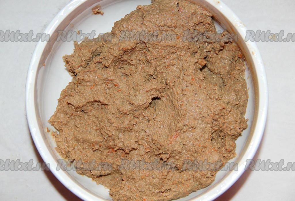 Пышный и воздушный паштет, приготовленный из куриной печени с сливочным маслом, морковью и луком, переложить в форму, в которой вы будете в дальнейшем отправлять паштет в холодильник.