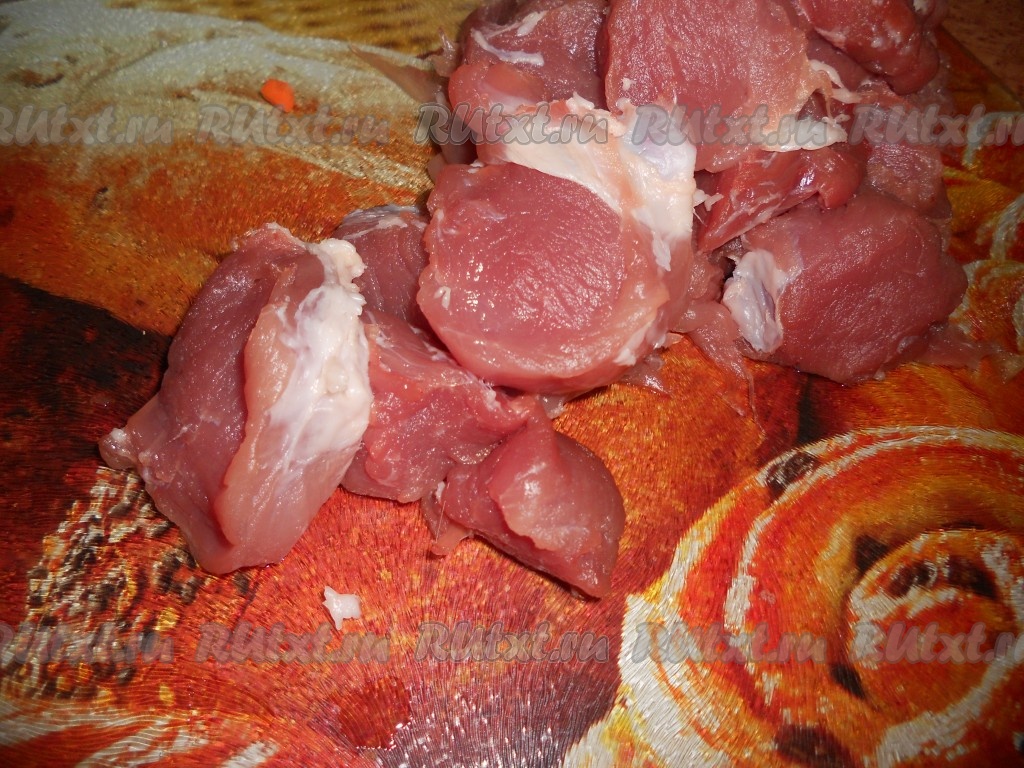 Свинину вымыть, обсушить, нарезать на средние кусочки. Очистить морковку, чеснок и лук. Удалить семена и плодоножку из болгарского перца.
