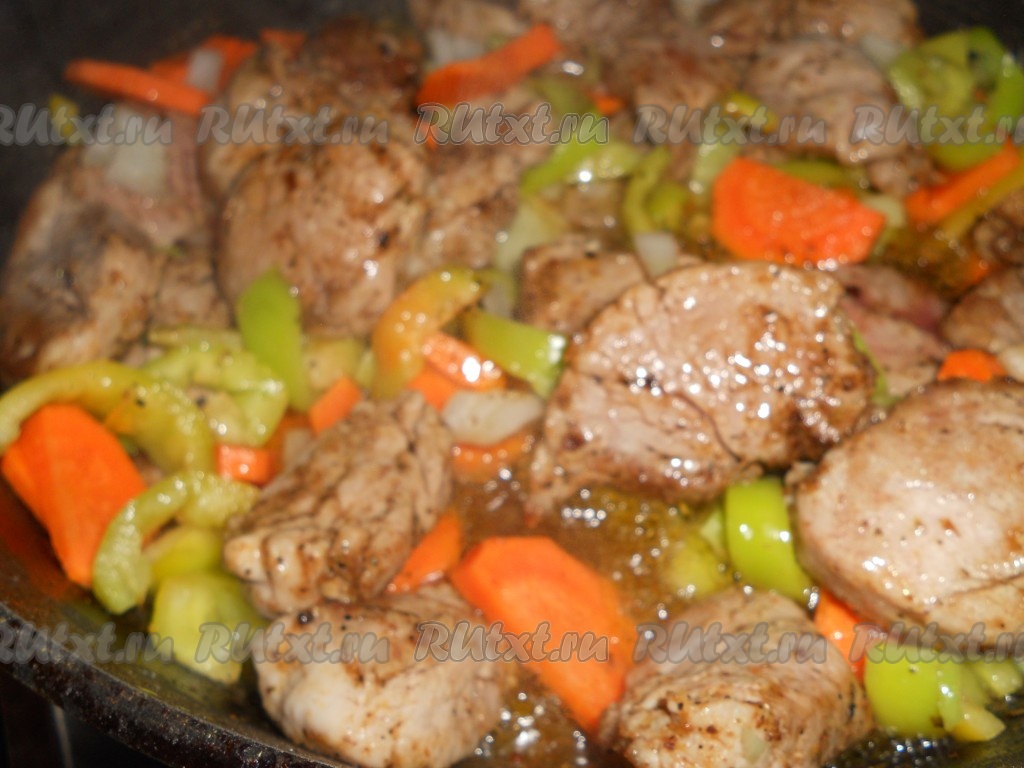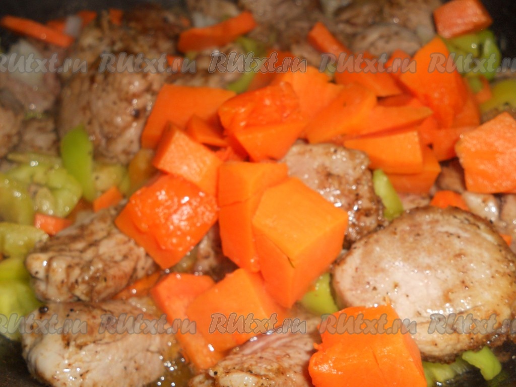 На сковороду налить растительное масло, разогреть его, выложить морковь, нарезанную на тонкие полукружочки, и мелко нарезанный лук, перемешать овощи и обжаривать в течение 5-7 минут на среднем огне, иногда помешивая. Затем добавить болгарский перец, нарезанный на полоски, перемешать, обжаривать 2-3 минуты, иногда помешивая. К обжаренным овощам выложить кусочки свинины. Обжаривать мясо с овощами минут 7-10, периодически помешивая.