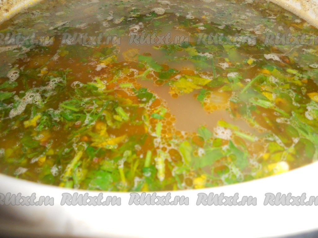 Когда все будет готово, снять  гречневый суп с лисичками с огня и  добавить мелко порезанный чеснок, зелень.