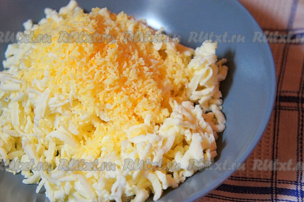 Приготовим сырную начинку для слоек. Для этого оба сыра натереть на тёрке, перемешать. Начинку разделить на 4 части и из каждой сформировать "сырный шар".