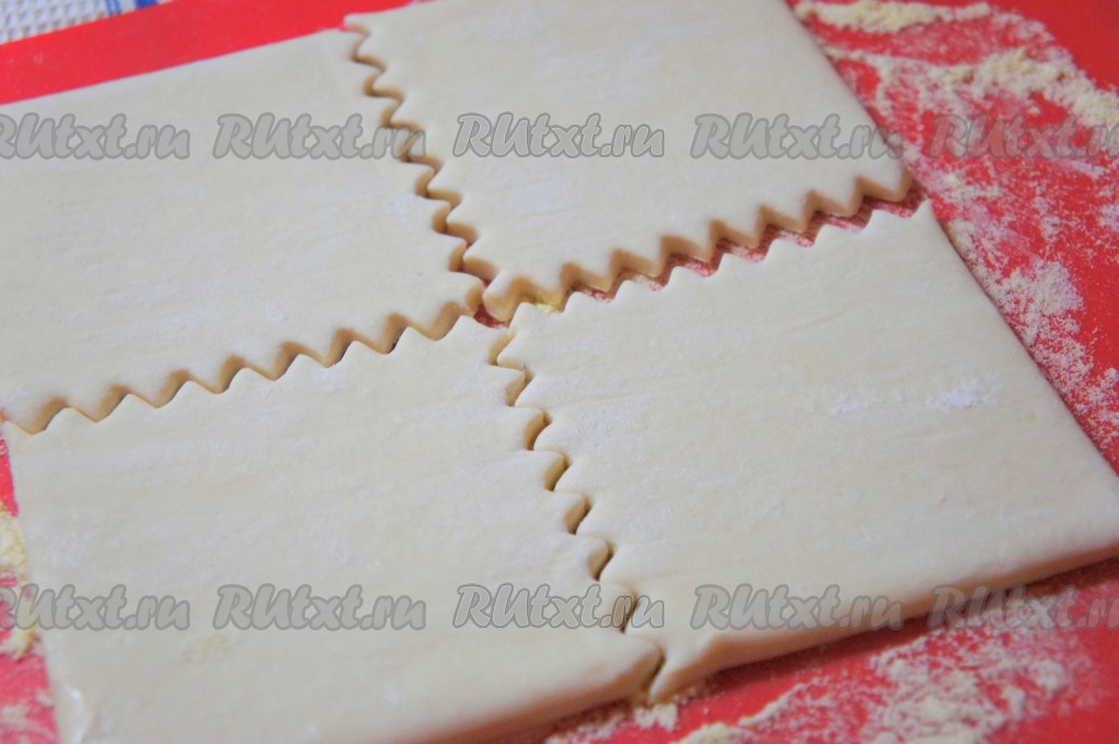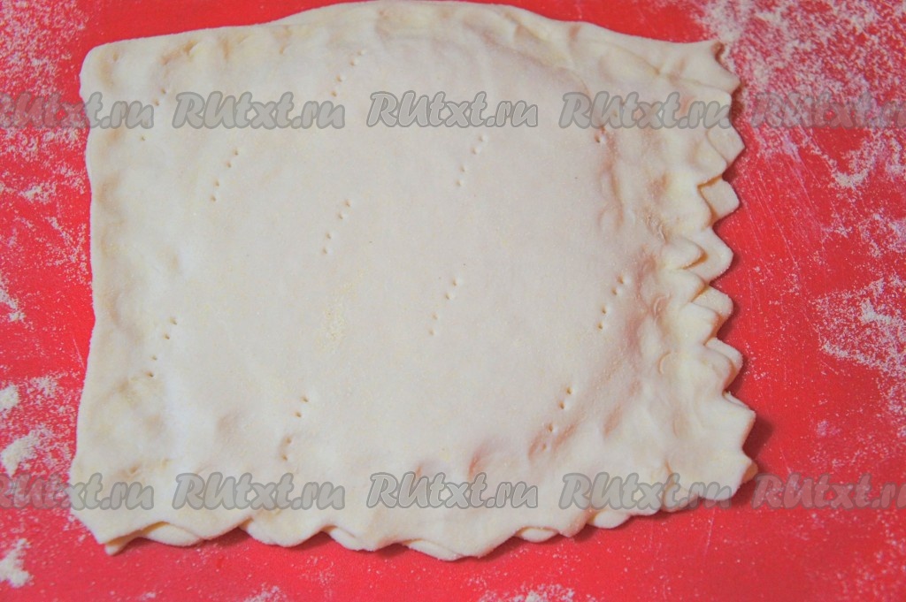 В итоге должно получиться четыре слойки. На каждой сделать несколько наколов вилкой, чтобы тесто не вздувалось при готовке.