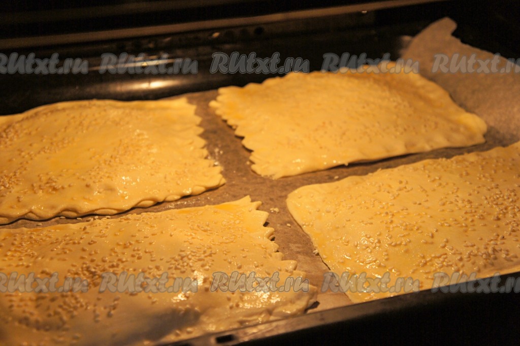 Духовку разогреть до 200-220 градусов. На противень расстелить бумагу для выпечки, смазать её растительным маслом с помощью кондитерской кисти. Слойки смазать взбитым яйцом и посыпать кунжутом. Выпекать слойки с сыром 20 минут. При выпекании не открывайте духовку (!).