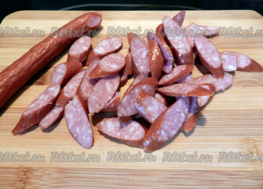 Колбасу (я взяла охотничьи колбаски) нарезать на кусочки.