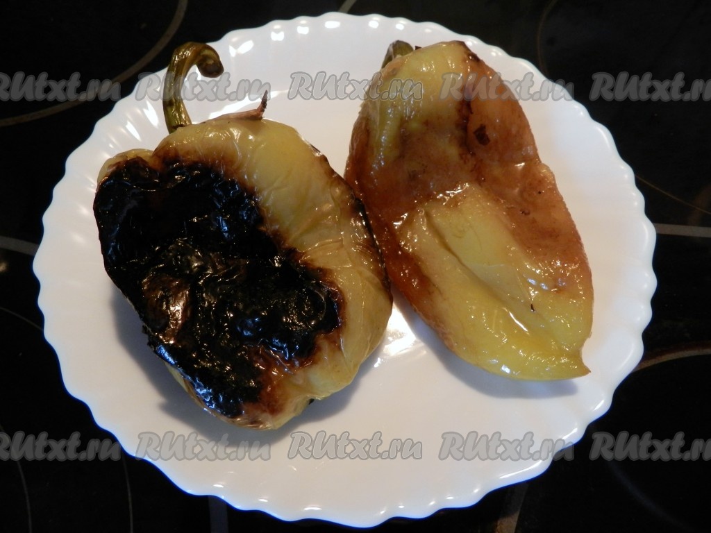 Жареный перец положить в чистый полиэтиленовый пакет и остудить (это делаем для того, чтобы легко снять кожицу с перца). Когда перец остынет, снять с него кожицу и очистить от семян.