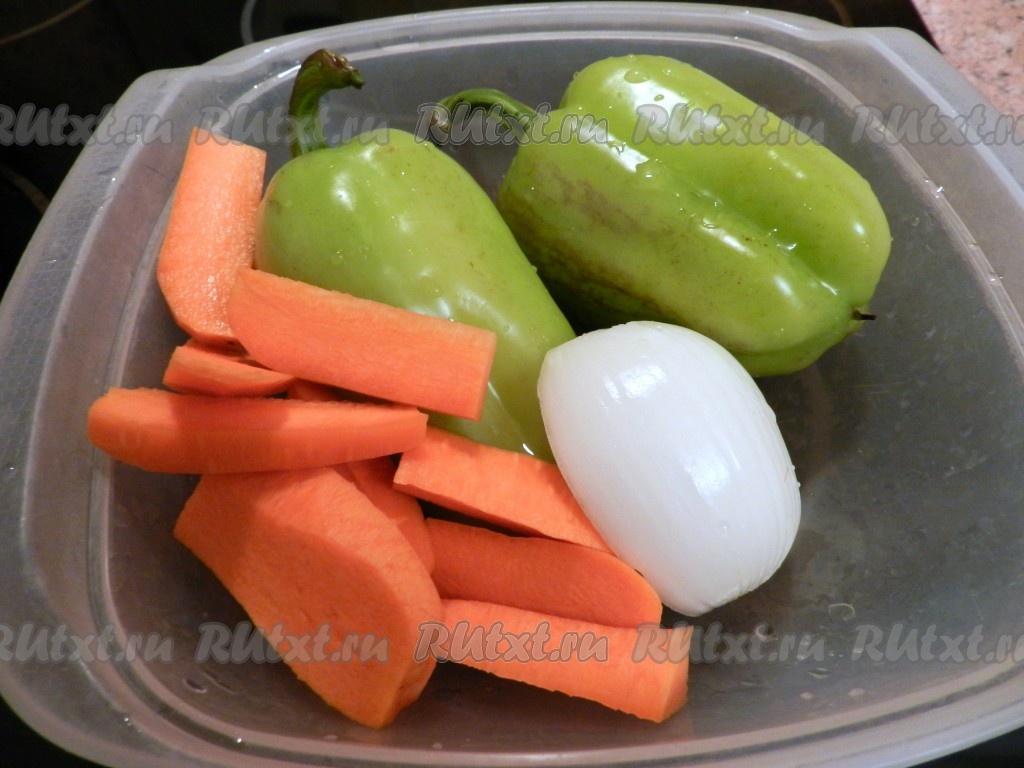 Лук, болгарские перцы и морковь вымыть. 1 луковицу и морковь очистить.