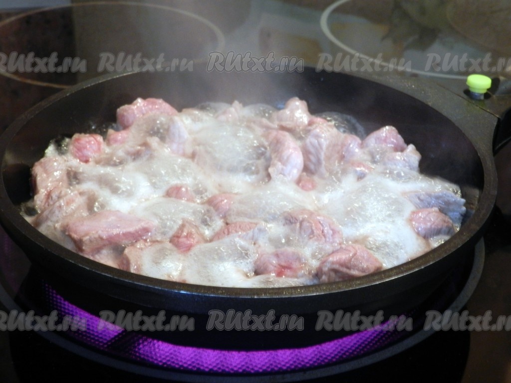 В сковороде разогреть растительное масло, выложить кусочки сырой говядины, обжарить их на сильном огне 10 минут (до румяности), перемешивая время от времени, чтобы мясо не подгорело. Затем влить, примерно, 0,5 стакана воды, уменьшить огонь, накрыть сковороду крышкой и тушить кусочки говядины до готовности (минут 30-40 минут). Мясо должно стать мягким.