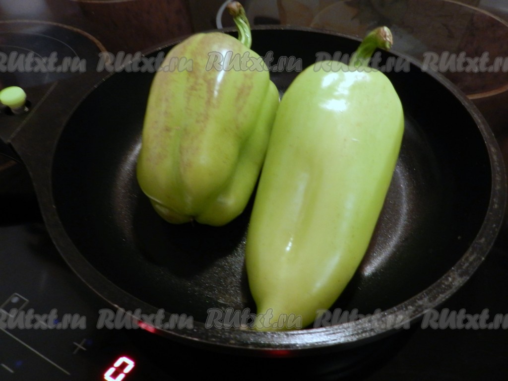 Болгарские перцы вытереть насухо. В сковороду налить немного масла, выложить перцы, накрыть крышкой и поджарить на сильном огне, периодически поворачивая всеми бочками, до мягкости перчиков.