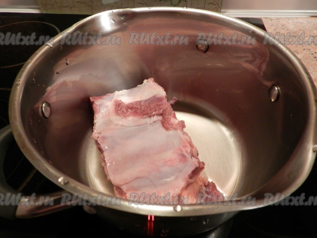 Мясо с косточкой вымыть, положить в кастрюлю, залить 2,5 литрами воды и поставить на огонь. Когда вода закипит, снять пену.