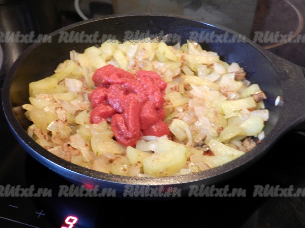 На отдельной сковороде обжарить на растительном масле лук до прозрачности на среднем огне, не забывая помешивать. Добавить огурцы и томатную пасту, немного бульона и тушить на медленном огне под крышкой до мягкости огурцов.