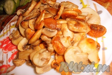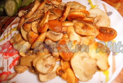 Нарезать грибы (любые по вашему вкусу) и обжарить в небольшом количестве масла, посолить и поперчить.