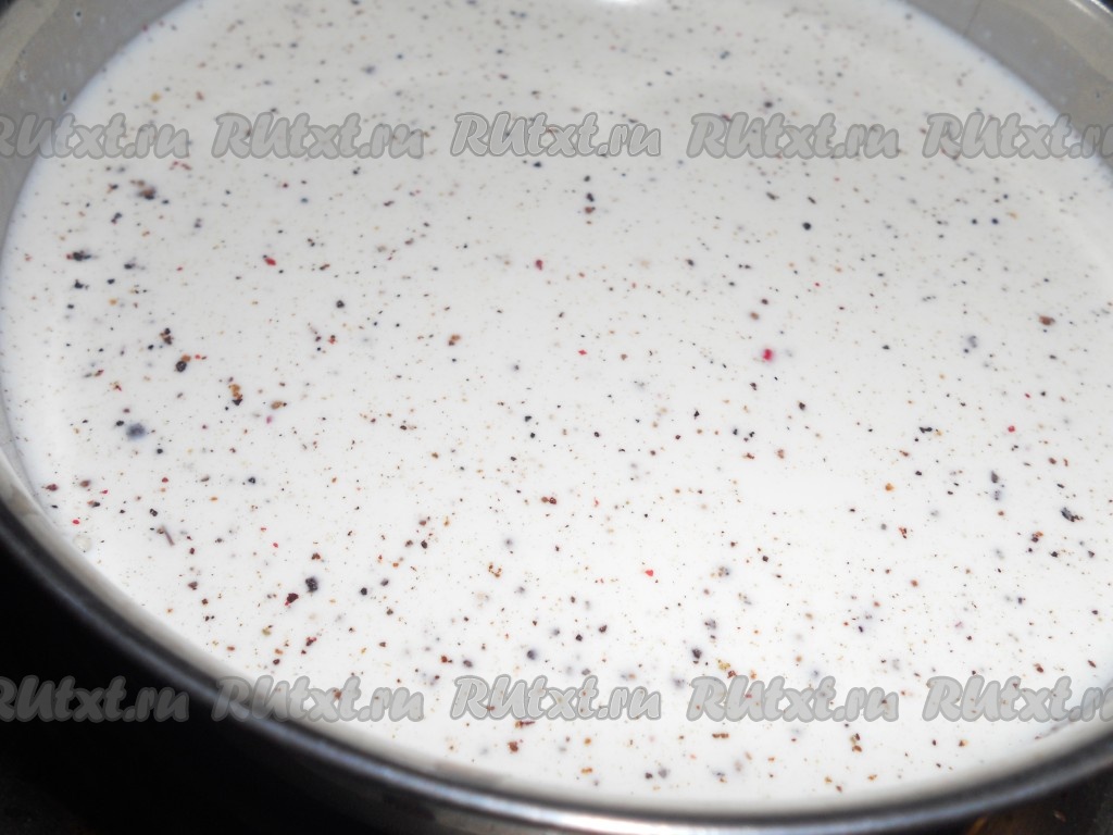 Затем приготовить тесто для пельменей: в миску влить сливки и молоко, вбить яйцо.