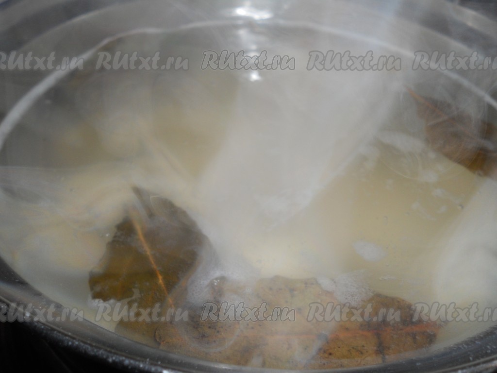 Пельмени положить в кипящую воду и слегка отварить (как всплывут сразу достать шумовкой в тарелку), можно добавить лавровый листик.