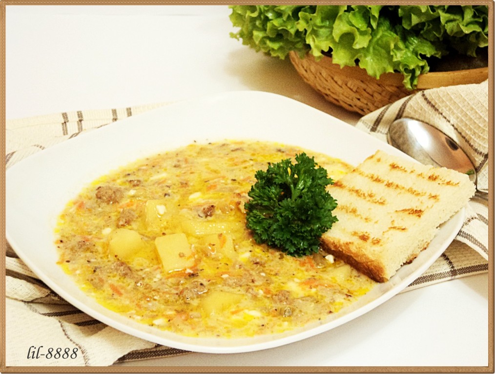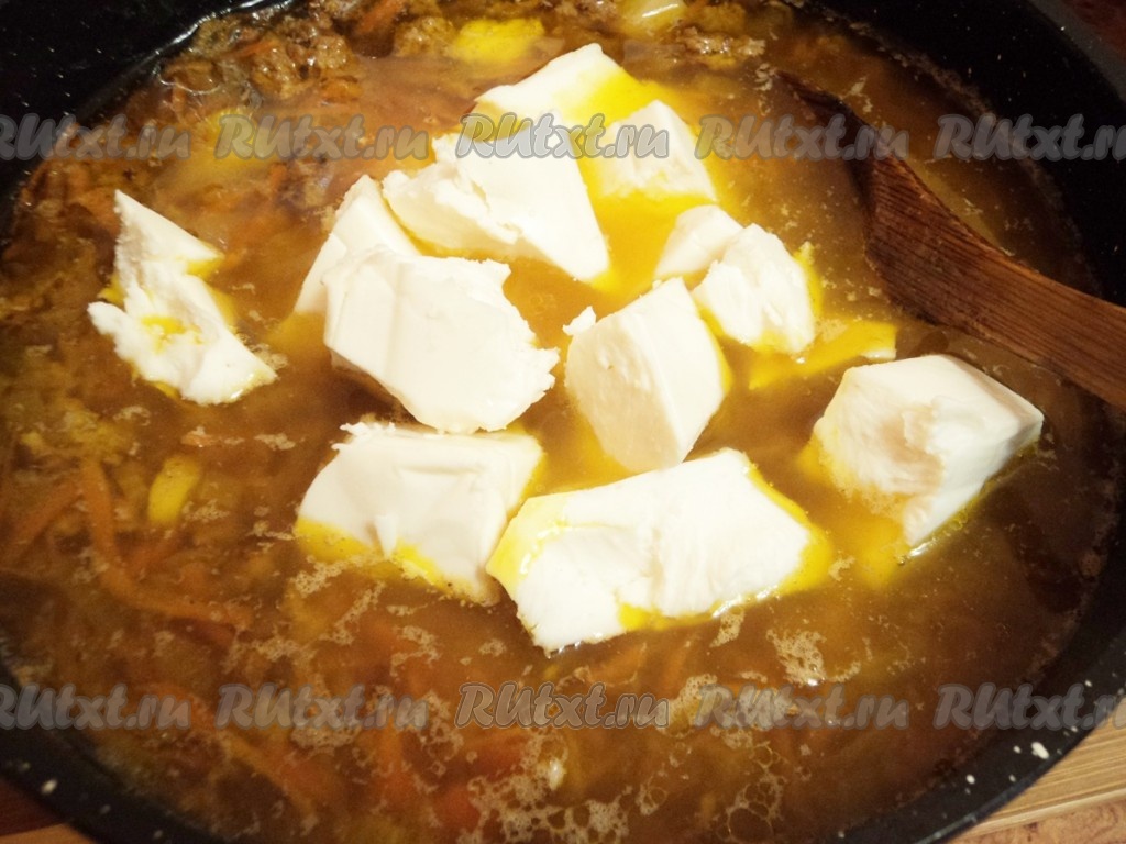 Затем добавить сыр в суп с мясом и овощами. Когда сыр растворится, влить молоко. Посолить, поперчить по вкусу.