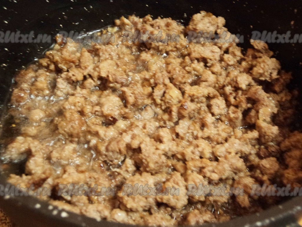 Налить масло в кастрюлю с толстым дном. Обжарить фарш до золотистого цвета, затем переложить шумовкой в тарелку.