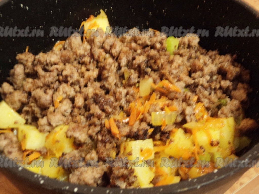 В кастрюле, в том же масле, обжарить сначала лук, затем добавить морковь и сельдерей. Затем добавить картофель, обжаривать еще минуту. Затем добавить фарш к овощам, влить бульон и готовить на маленьком огне до готовности картофеля.