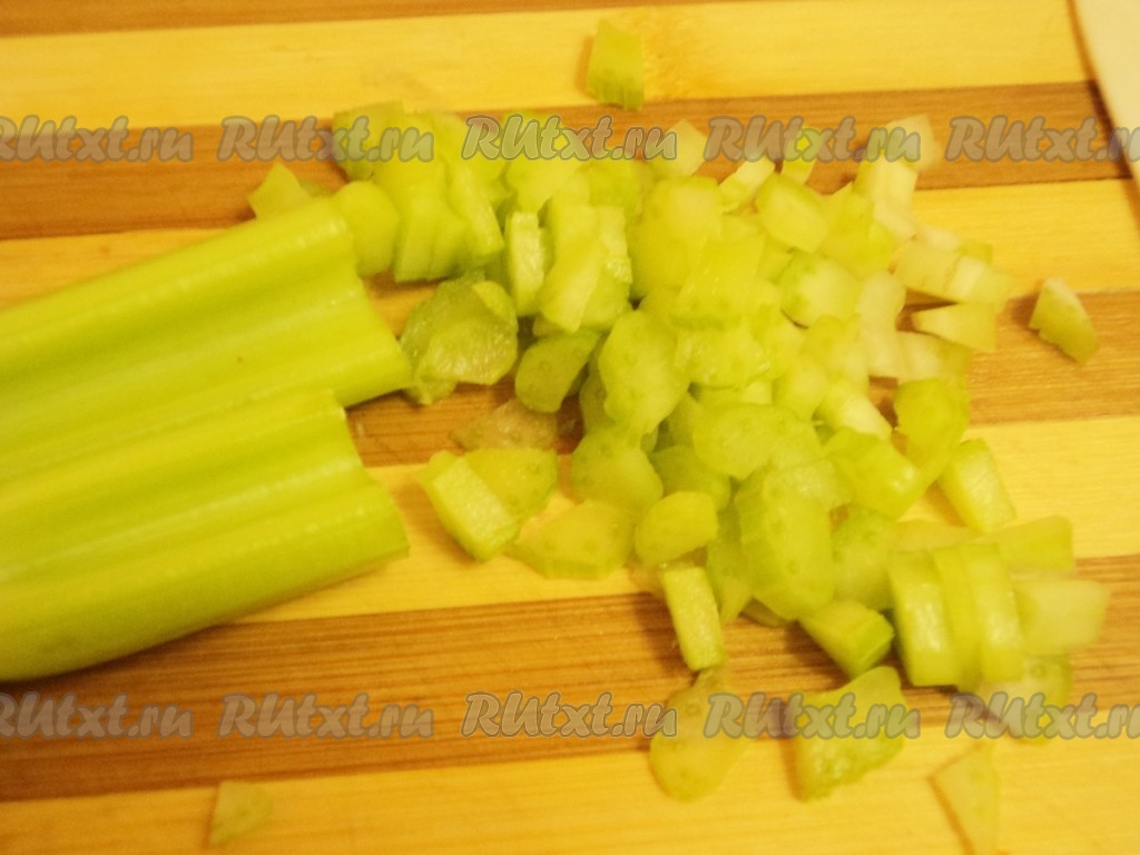 Сельдерей нарезать мелким кубиком.