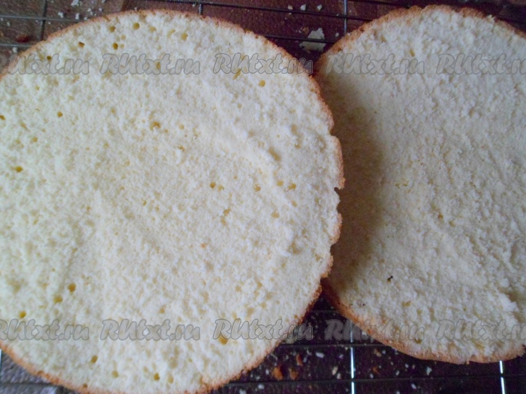 Затем испекшийся бисквит остужаем на решетке. Теплым разрезаем бисквит пополам и даём полностью остыть.