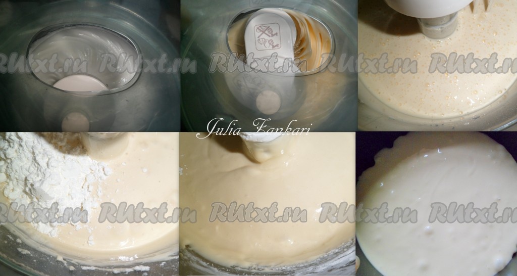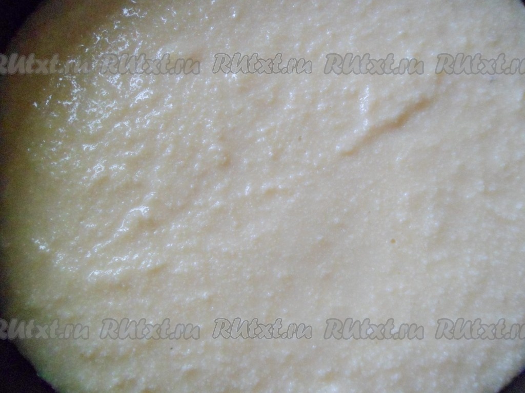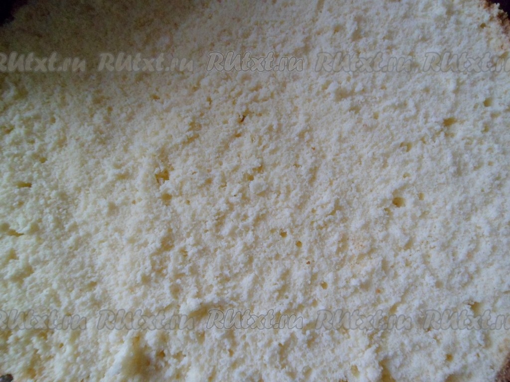 Готовим бисквит. Белки отделяем от желтков. Белки взбиваем в кухонном комбайне с 2 столовыми ложками воды в пышную пену, затем вводим желтки, продолжая взбивать, сахар, ванилин. Затем добавляем крахмал и муку, перемешанную с разрыхлителем. Полученную массу вливаем в разъемную форму, дно которой застелено пекарской бумагой. Выпекаем в разогретой до 180 градусов духовке 20 минут до зарумянивания.
