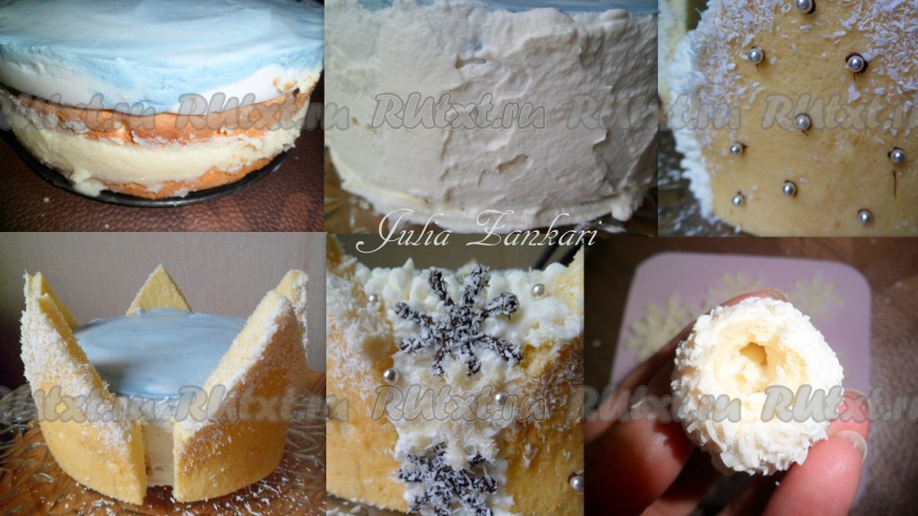Предлагаю Вашему вниманию торт "Снежная королева" с кокосовым муссом, белым шоколадом, взбитыми сливками. Я придумала его сама, захотелось зимней вкусной сказки.