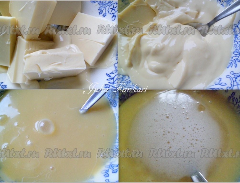 Делаем шоколадный крем - растапливаем шоколад в микроволновой печи, хорошо размешиваем до однородной массы. Оставляем на время остыть. Желатин замачиваем в воде, затем подогреваем для растворения. Вводим желатин в шоколад и перемешиваем. Оставляем на некоторое время для загустения.