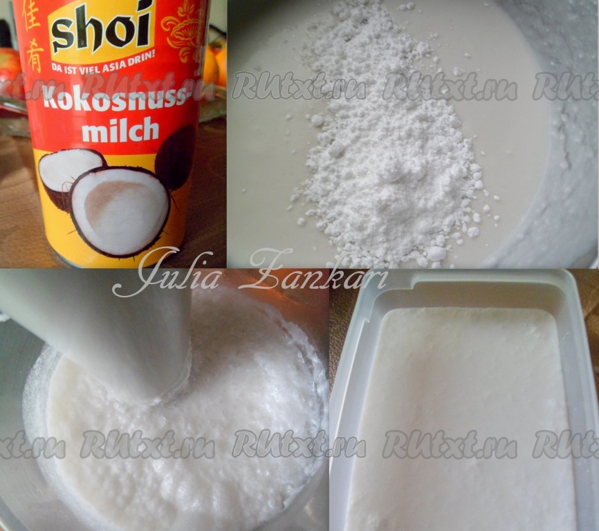 Берем кокосовое молоко, наливаем в чашку. Желатин замачиваем и растворяем, соединяем с кокосовым молоком и сахарной пудрой, взбиваем все погруженным миксером. Заливаем в форму и отправляем в холодильник до застывания.