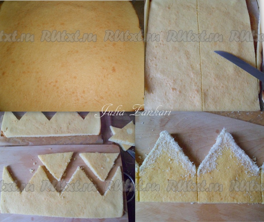В это время сделаем тесто для наружного (бисквитного) оформления: все ингредиенты смешиваем и немного взбиваем венчиком. Затем выливаем на лист, застеленный пекарской бумагой, и выпекаем 10 минут до легкого зарумянивания. Разрезаем бисквит пополам, ровняем края ножом. Затем вырезаем "домики" для короны, обрисовав края шоколадом или сливками, присыпав кокосовой стружкой.