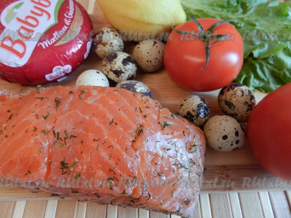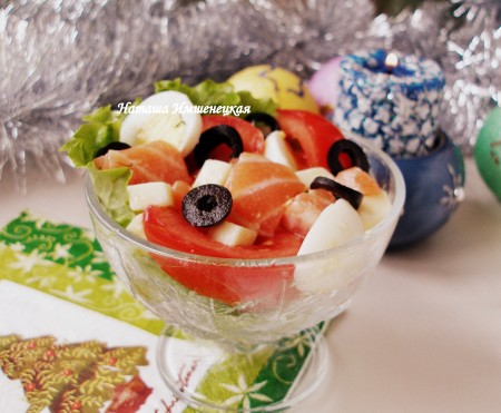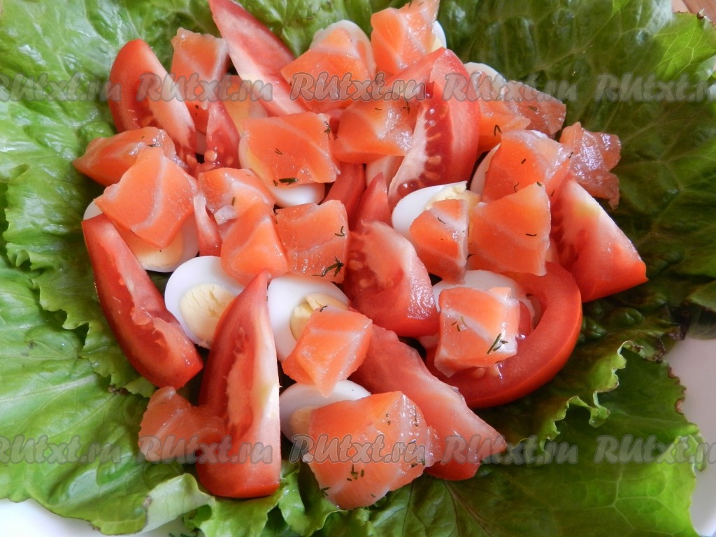 Очень вкусный салат с семгой и помидорами может стать украшением праздничного стола. Его можно подать порционно или на общей тарелке.