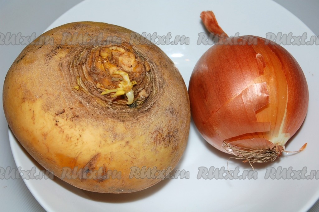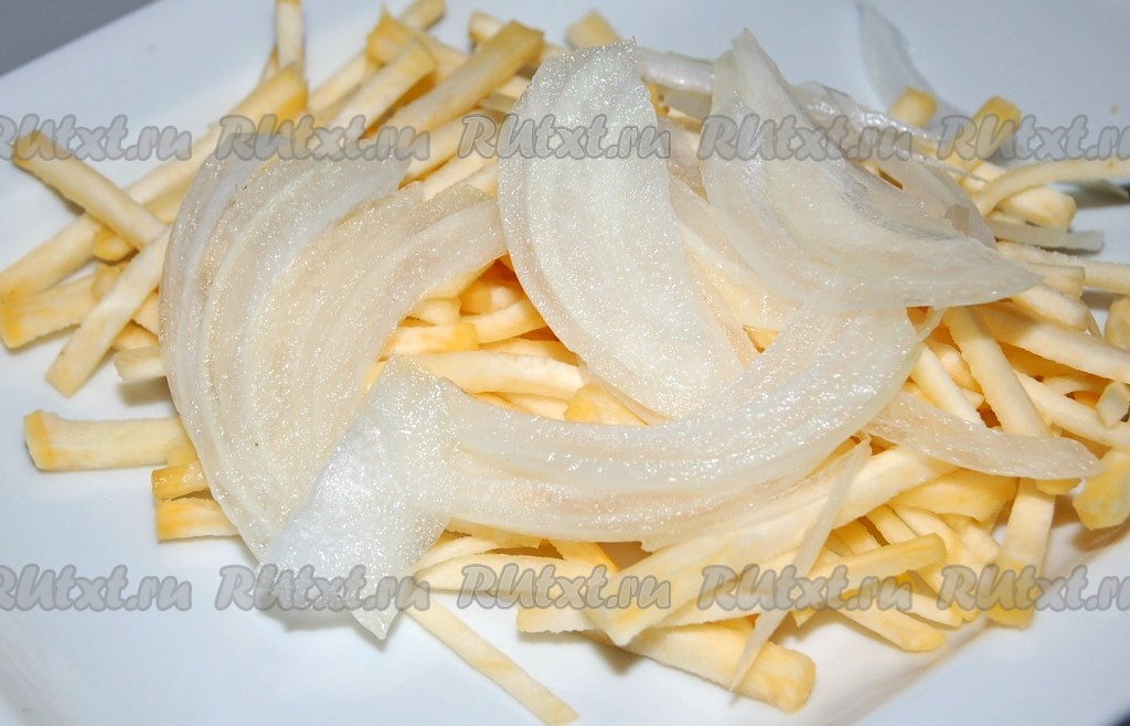 Лук репчатый нарезать тонкими ломтиками и добавить к репе.