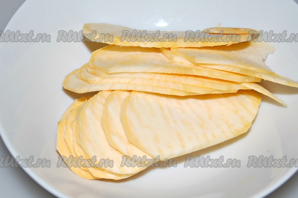 Репу очистить от кожуры и нарезать тонкими ломтиками.