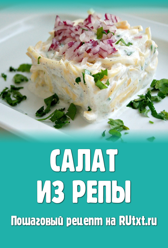 Репа незаслуженно забыта в нашей кулинарии. Ее мало готовят и о ней мало говорят, хотя она заслуживает самых теплых слов и самого пристального внимания. А ведь репа относится к тем овощам, которые могут восполнить нам нехватку витаминов и полезных веществ, которые так необходимы нашему организму зимой. Тем более, репа прекрасно хранится в зимний период и остается очень вкусной и сочной. Сегодня я предлагаю вам чудесный рецепт салата из репы. Обязательно сделайте его, вас поразит нежный и мягкий вкус сырой репы. Заправить салат можно сметаной или растительным маслом.