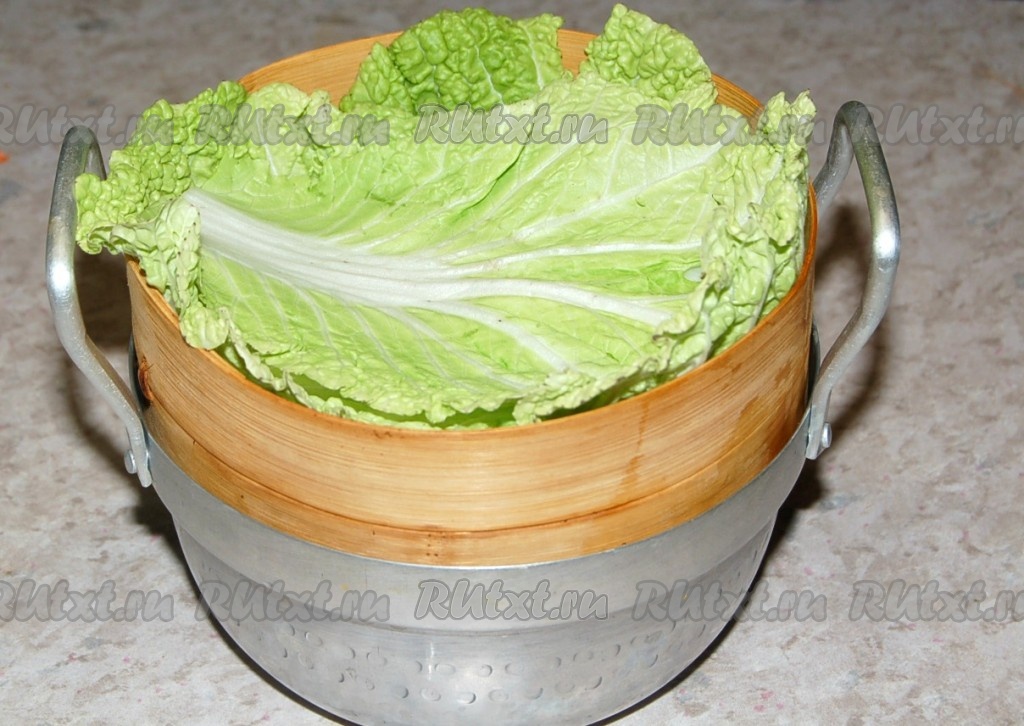 Дно решета пароварки выложить листьями пекинской капусты.