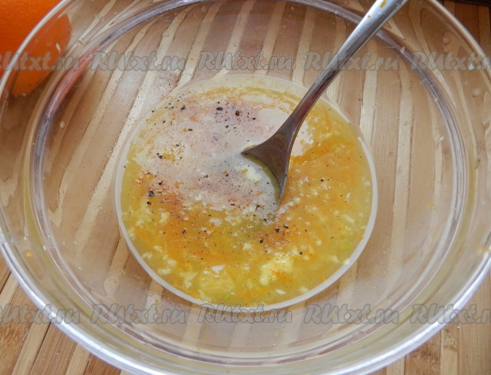 С одного апельсина снять цедру и выдавить сок, добавить очищенный и натёртый на тёрке имбирь, а также чеснок, пропущенный через пресс, мёд, чёрный молотый перец, специи, перемешать получившийся маринад.