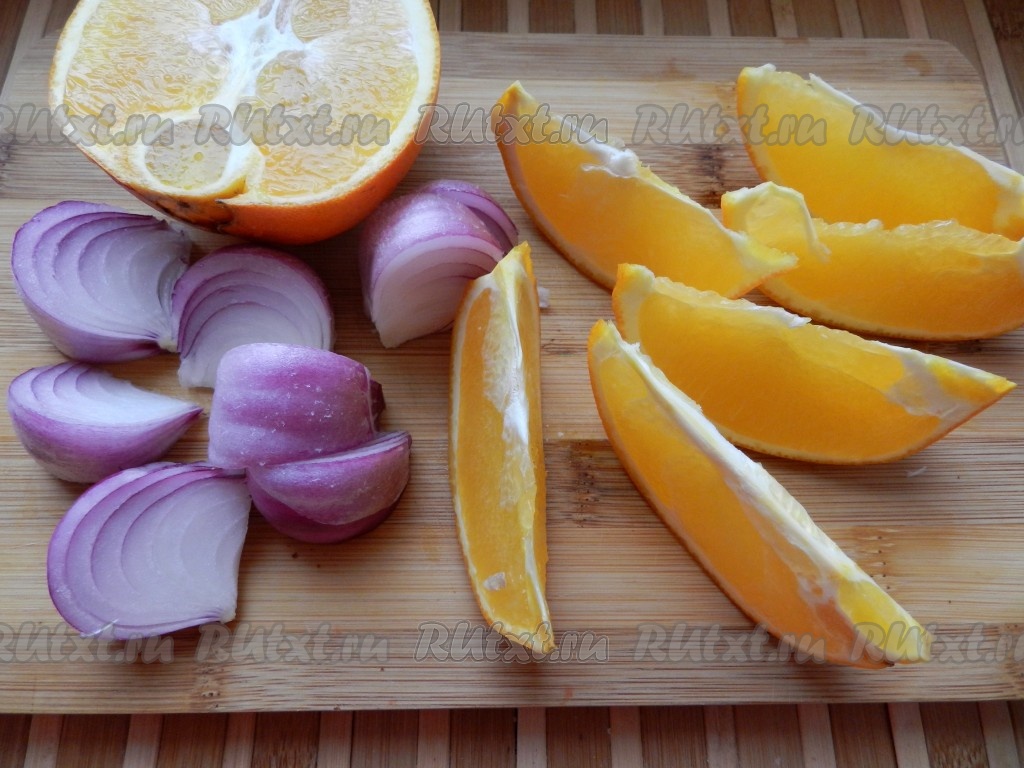 Второй апельсин тщательно вымыть и, не очищая от кожуры, нарезать на дольки. Очищенную луковицу тоже нарезать на дольки (тонко резать не нужно).