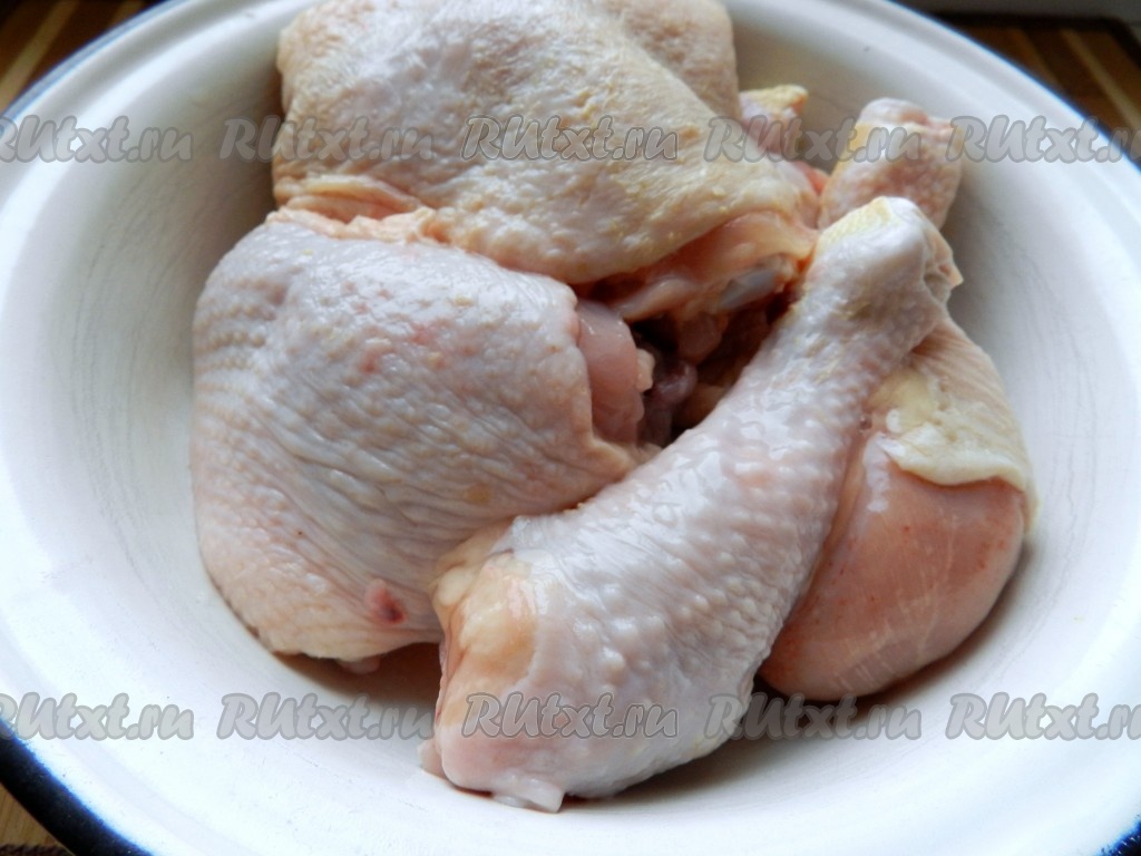 Кусочки курицы вымыть, обсушить, разрезать на порционные части (я разрезала каждый окорочок на 2 части).