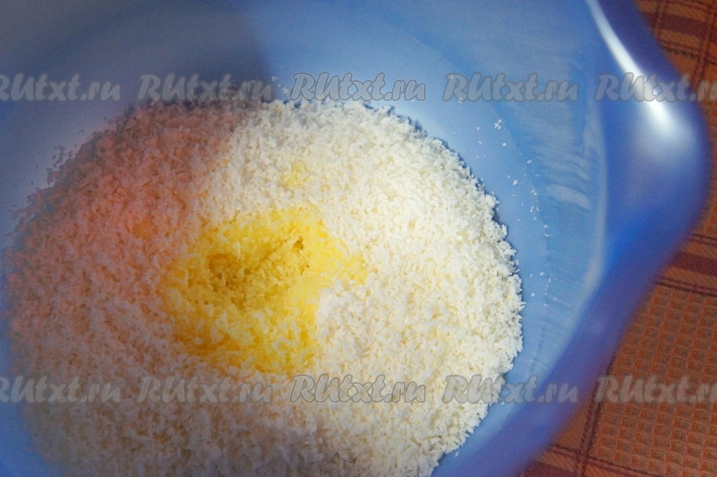 Добавить к кокосовой стружке ванилин и растопленное сливочное масло, тщательно перемешать.