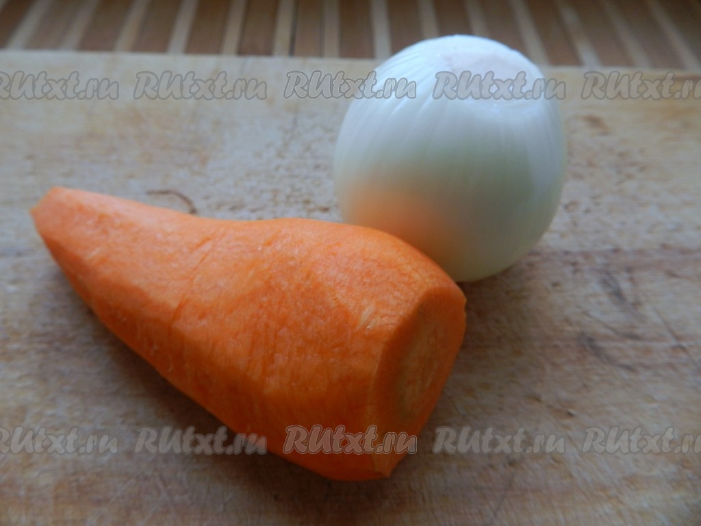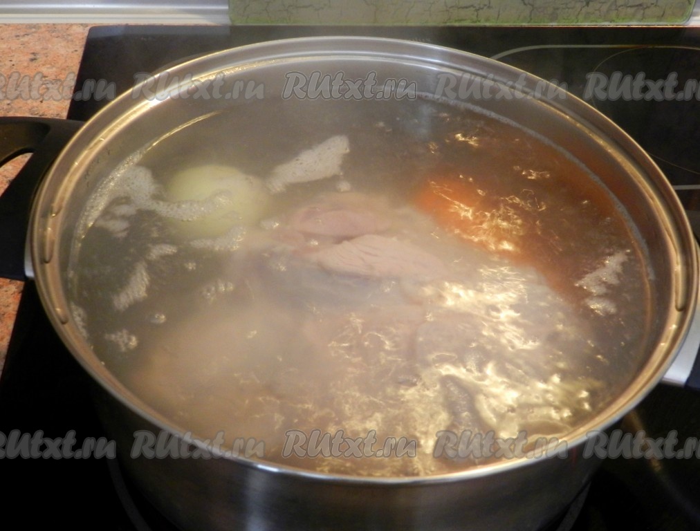 В большой кастрюле вскипятить воду. Опустить в нее мясо, довести до кипения. Когда вода снова закипит, снять пену, положить в воду морковь и луковицу, уменьшить огонь и варить под крышкой до готовности свинины 1 час или более.