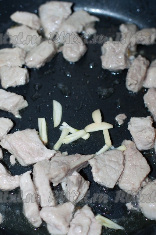 Чеснок очистить, нарезать соломкой и отправить в сковороду к мясу минутки за 3-5 до готовности. Обжаренное мясо посолить, приправить перцем, снять с плиты и держать в тепле.