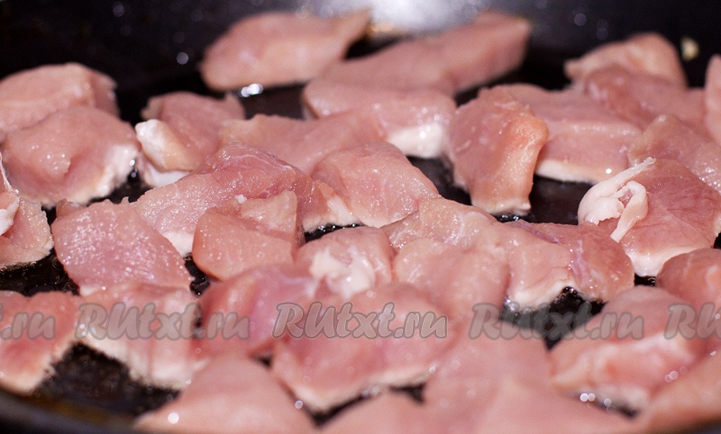 Свинину нарезать небольшими кубиками и выложить на сковороду, обжаривать на масле до готовности, периодически помешивая.