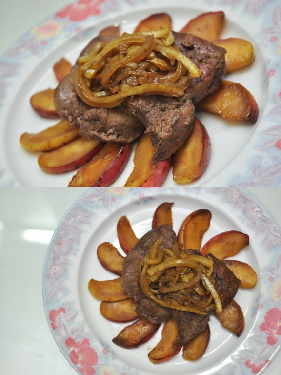 При подаче блюда на стол сначала выкладываем яблоки. Затем печень и сверху лук.