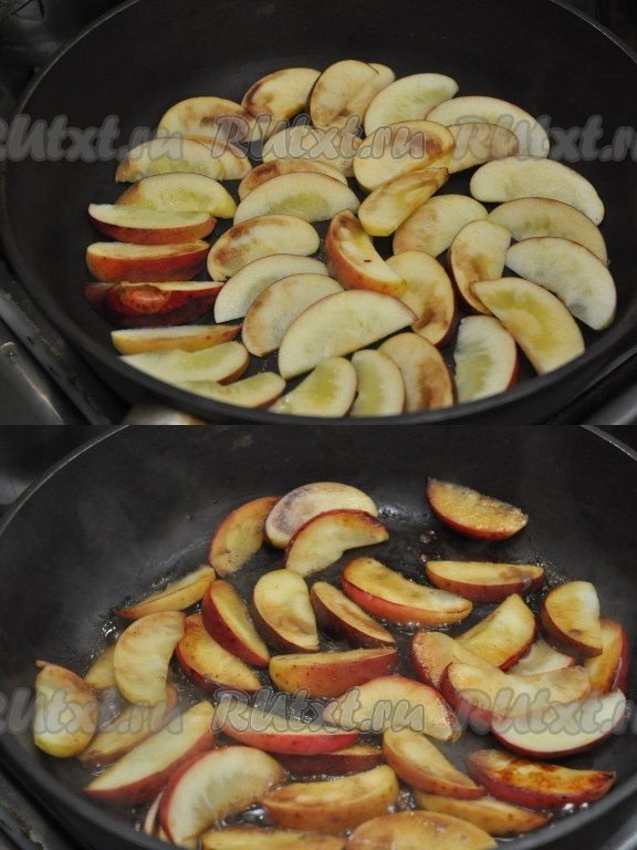 На разогретую сковороду без масла (если ваша сковорода это позволяет) выкладываем яблоки, обжариваем с одной стороны 3 минуты. Переворачиваем. Доливаем печеночный сок и так же тушим.