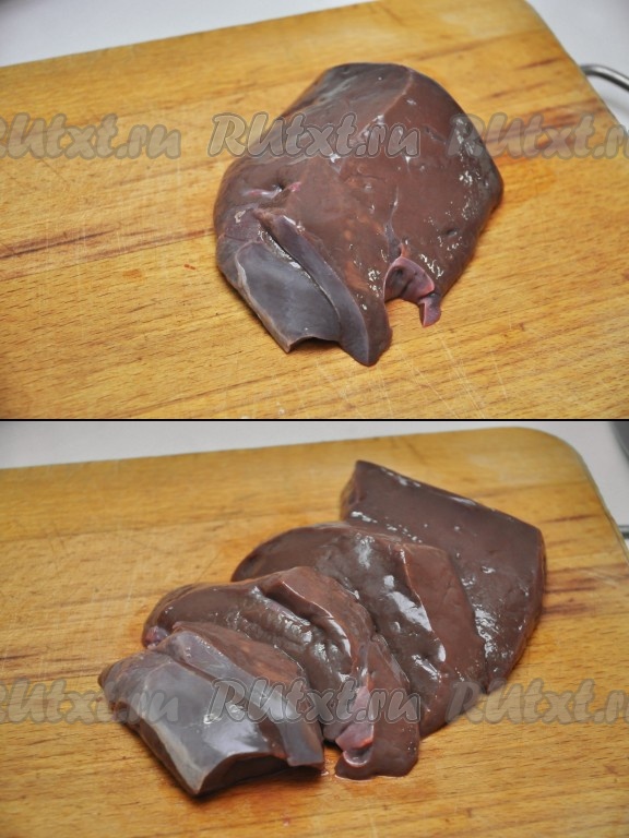 Печень нарезаем тонкими кусочками, приблизительно один сантиметр толщиной, можно отбить, но и так будет нежная.