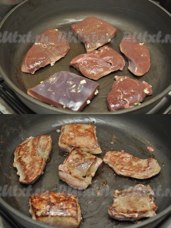 Обжариваем кусочки печени с обеих сторон по 3-4 минуты. Затем наливаем немного (30-50 мл) теплой воды, накрываем крышкой и тушим в течение 5 минут. Оставшийся сок от печени не выливаем, он нам еще пригодится.